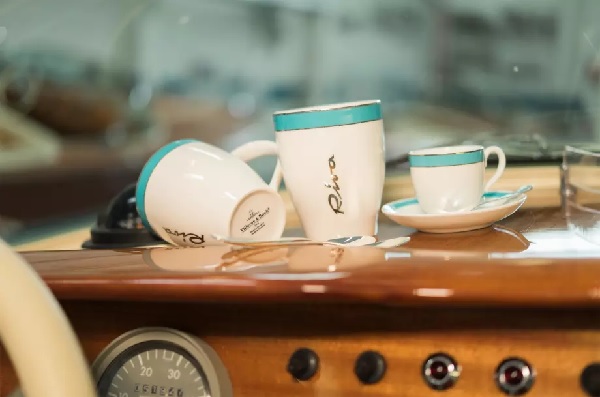 The product line includes a two-piece Espresso set and a mug in the boatyard’s corporate colour, mint green, decorated with a fine platinum border.