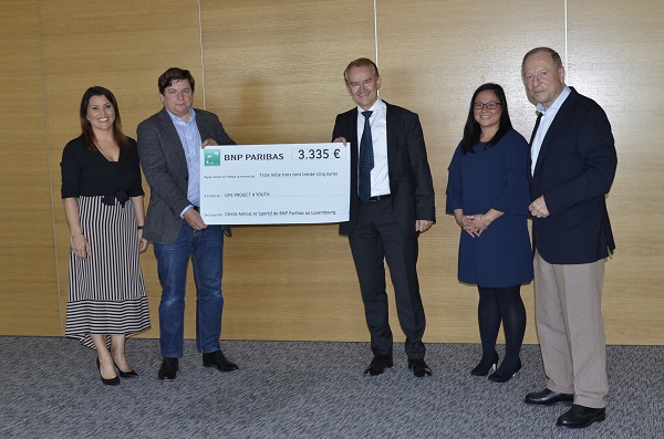 During a ceremony held on 3 October 2018, Marc Lenert, member of the Executive Committee of BGL BNP Paribas and Chairman of the Cercle Amical et Sportif (C.A.S.), and Christine Donati, Chairwoman of the C.A.S. Running Section, presented a cheque for €3,335 to Jean-Marie Demeure, vice chairman of the Life Project 4 Youth (LP4Y) Luxembourg.