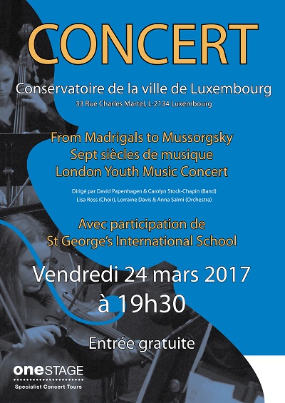 The Conservatoire in Luxembourg city will host a concert entitled "From Madrigals to Mussorgsky" on Friday 24 March 2017 at 19:30 featuring 160 young musicians from London in collaboration with St George's International School Luxembourg.