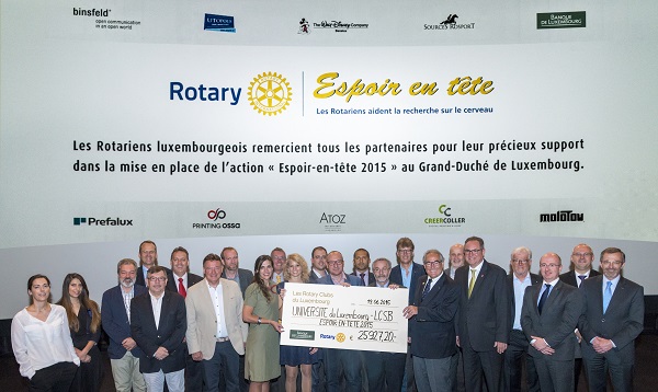 Rotary Clubs in Luxembourg, from their 3rd anuual Espoir en tête initiative, presented a cheque worth €25,927 to the Luxembourg University's Luxembourg Center for Systems Biomedicine on Friday at Utopolis in Kirchberg.