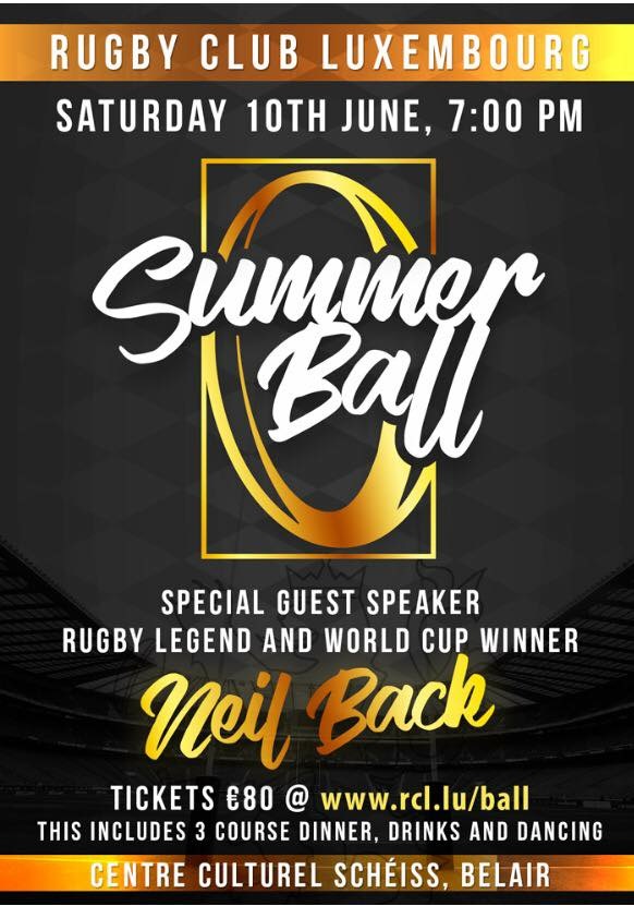 This year's Rugby Club Luxembourg (RCL) 2017 Summer Ball is being held on Saturday 10 June 2017 from 19:00 at the Centre Culturel Schéiss in Luxembourg-Belair, with Special Guest Neil Back, former England rugby international, who will address the event.