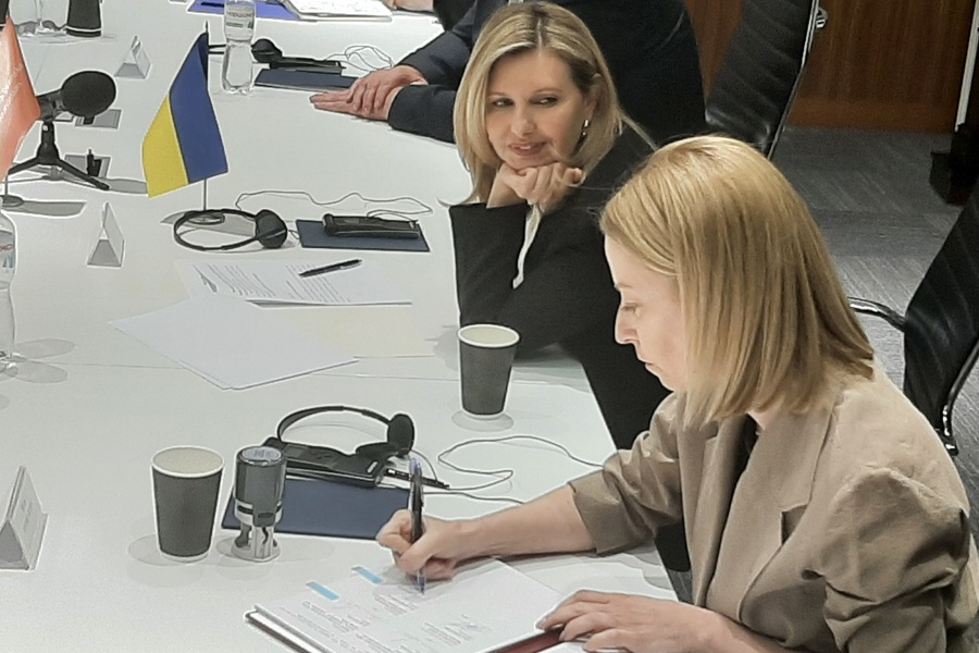 Minister Bettel emphasised the importance of psychological support before Olena Zelenska talked about the foundation's new projects (this part behind closed doors). It was followed by the signing (by Nina Horbachova for the foundation, and Minister Bettel for Luxembourg) of a new €1 million donation for the Olena Zelenska Foundation.