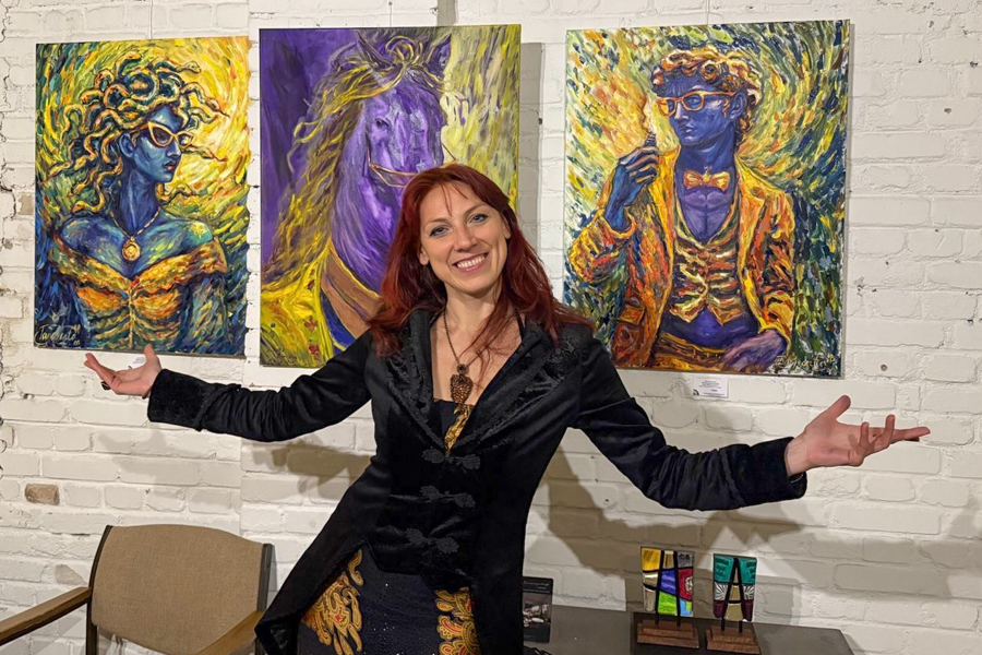 Oxana Berezhna’s works stand out for their bold colour palettes and layered symbolism. Trained in physics before pursuing art, she combines a structured approach with expressive visual language. Her creative process often involves exploring the same composition through several colour schemes. The exhibition includes one of her most recent works, completed shortly before the opening. Her paintings reference classical motifs, including Michelangelo’s David and Medusa Gorgon, which she reinterprets in a contemporary and often surreal context alongside the recurring horse motif.