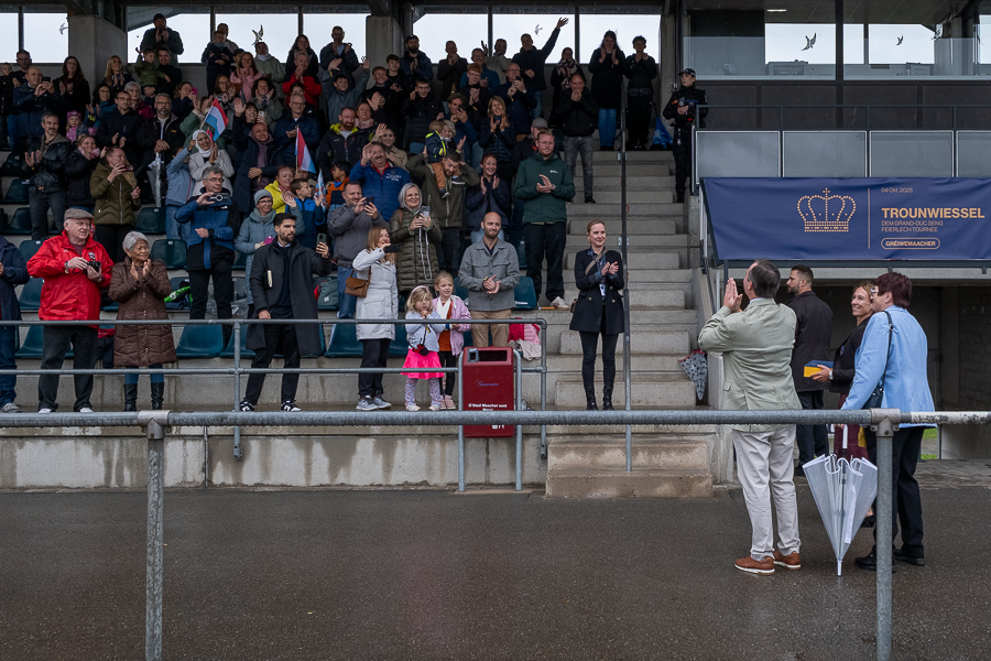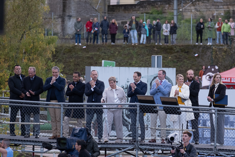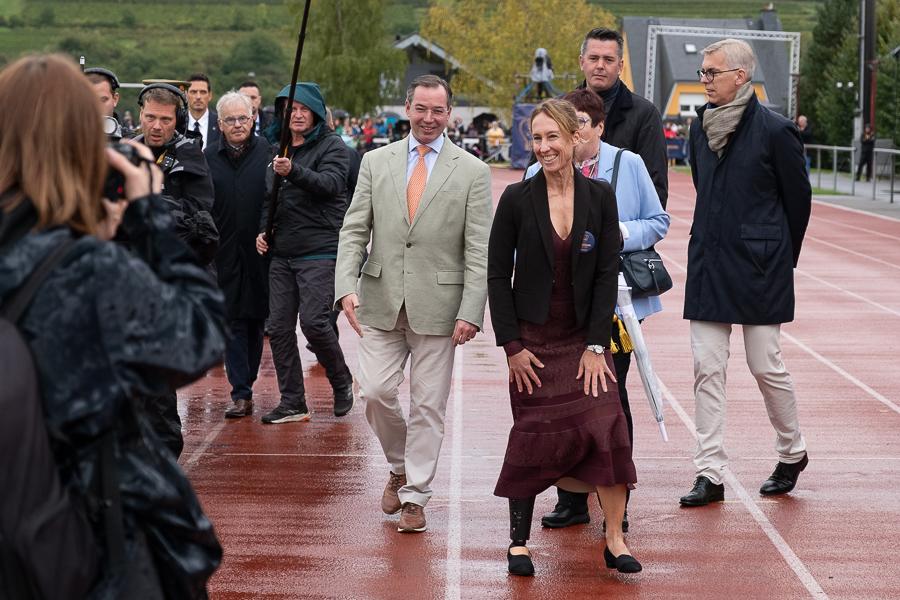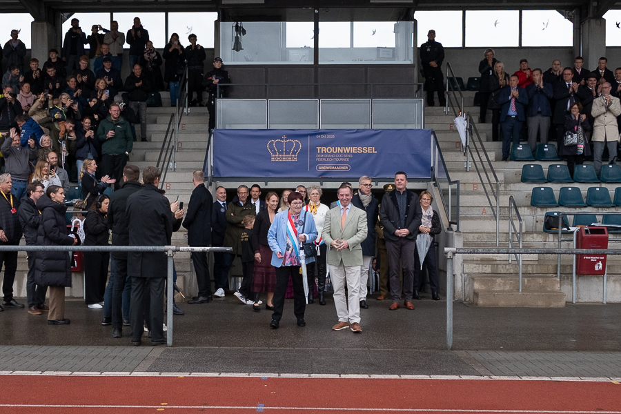 The tour began in Grevenmacher in eastern Luxembourg around 12:30. Grand Duke Guillaume was welcomed at the “Op Flohr” stadium by Luxembourgish retired tennis player Anne Kremer, Mayor Monique Hermes and other local officials, along with Luxembourg’s Minister of the Economy, SMEs, Energy and Tourism, Lex Delles, the Minister for Home Affairs, Léon Gloden, and Moselle “Wäikinnigin” (Wine Queen) Jill Wagner.