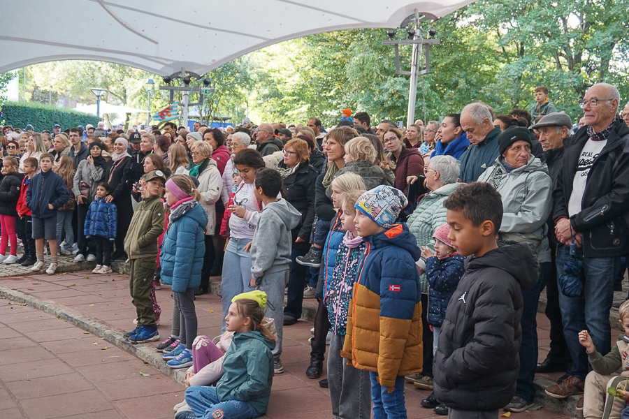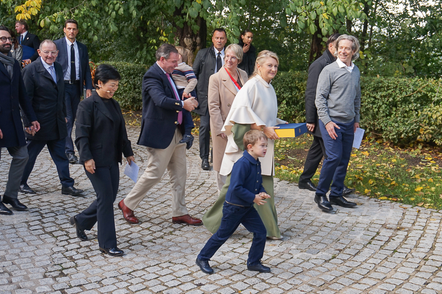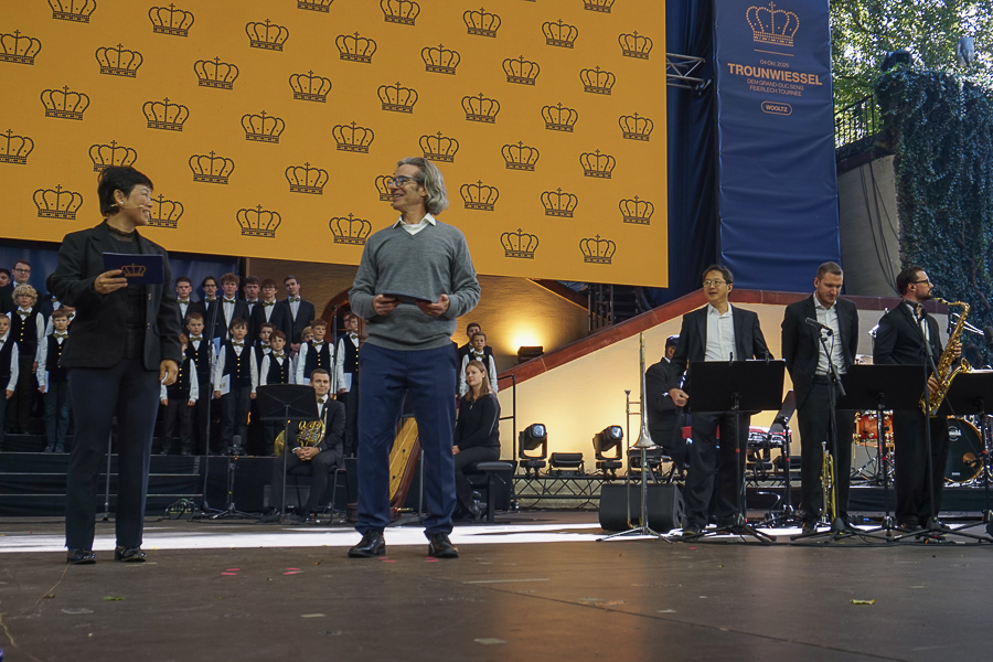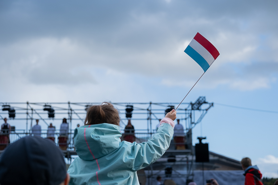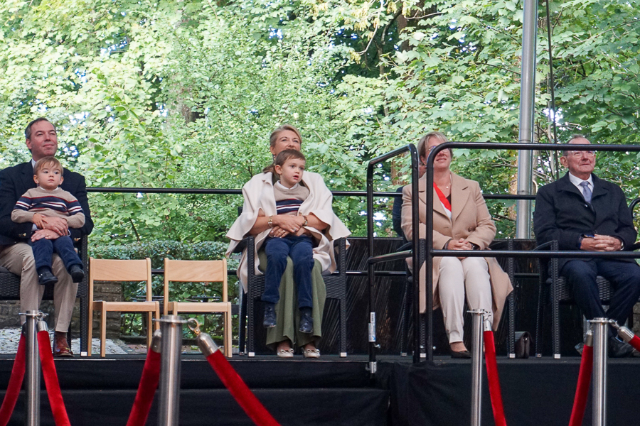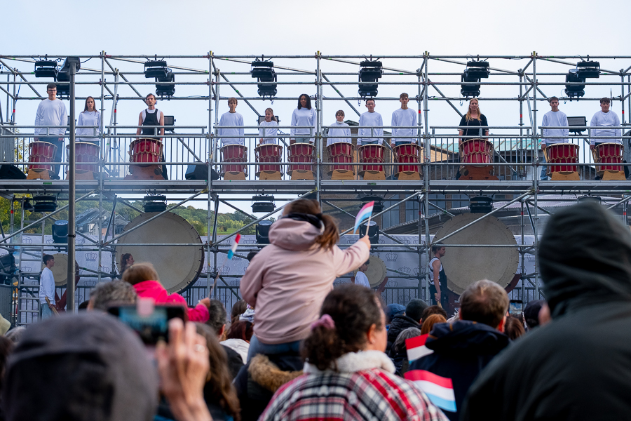 At Wiltz Castle, the Grand Ducal family were welcomed by table tennis champion Ni Xialian and writer Mike McQuaide (“An American in Luxembourg”), Mayor Carole Weigel and municipal officials, Luxembourg’s Minister of Agriculture, Food and Viticulture, Martine Hansen, and the Minister for Culture, Eric Thill, as well as invited guests, local association representatives and randomly selected Wiltz residents. Hundreds of people gathered at the amphitheatre to watch an inclusive theatre performance by “com-guck”, an interactive video projection from the “Schwätz mam Grand-Duc” (Speak with the Grand Duke) project and music from the Pueri Cantores youth choir and Naomi Aye & Band. The musicians performed a specially composed collaborative final piece before the Grand Ducal couple received another symbolic gift. The festivities continued in Wiltz after their departure around 15:30.