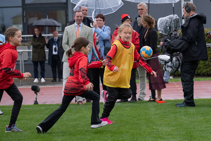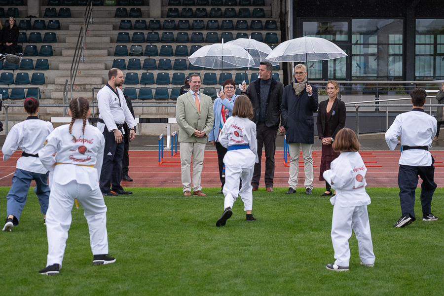 Children active in football and athletics guided the Grand Duke around the pitch. Inside the stadium, about 100 young players were training. Local clubs representing athletics, handball, taekwondo, football and table tennis were present. Grand Duke Guillaume exchanged with volunteer trainers, referees and club presidents, posed for a group photo on the pitch and received a symbolic gift at the end of his visit. A public reception was planned afterwards.