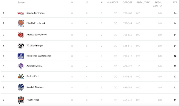 Three teams sit just behind Bertrange, each with six wins and two defeats. They also recorded victories over the weekend: current champions Etzella Ettelbruck beat Amicale Steinsel 85-71 away, last season’s finalists T71 Dudelange defeated Mambra Mamer 94-84 at home, while Arantia Larochette overcame newly promoted Racing Luxembourg 105-83 on the road.