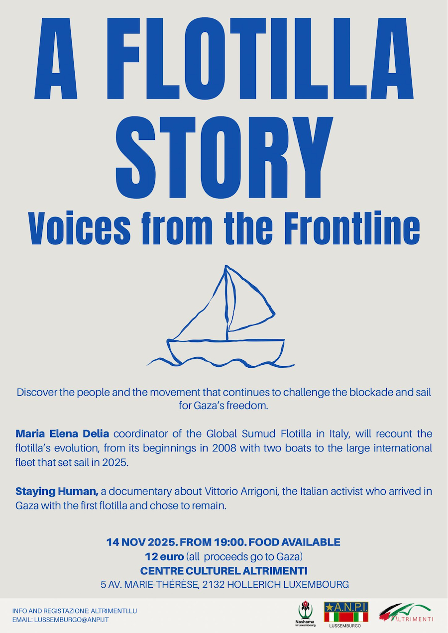 The Altrimenti cultural centre has announced it will host the event “A Flotilla Story: Voices from the Frontline” on Friday 14 November 2025 at 19:00, at its premises in Luxembourg-Ville (5 Avenue Marie-Thérèse, L-2132).