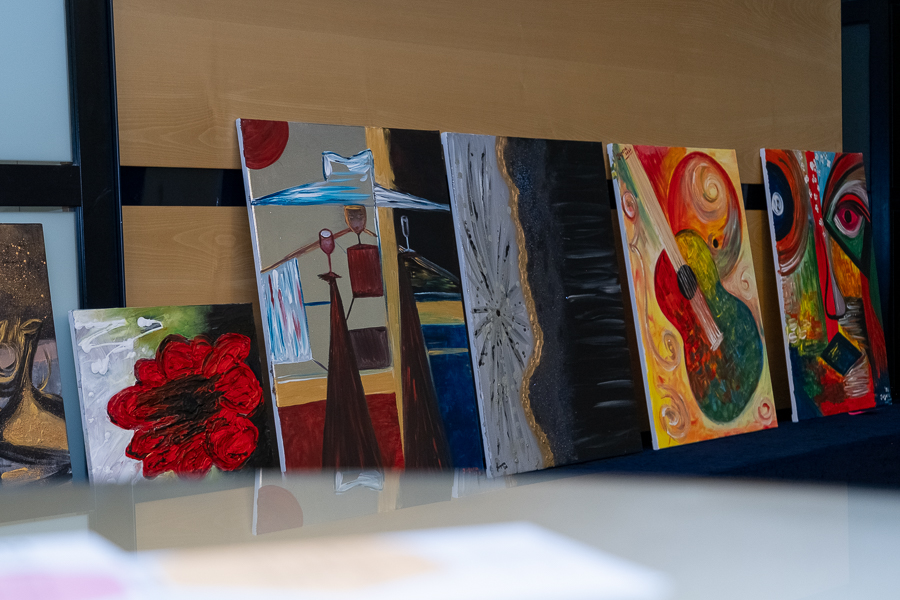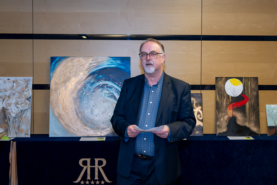 Geoff Thompson welcomed everyone to the event and explained that Jugera Ibrahimi had painted the circa 30 paintings herself over an eighteen-month period; mostly abstracts with some portraits in abstract form; mostly acrylic with some oil; none were with frames, enabling the new owners to choose their own; they all come with an original signed Certificate of Authenticity which includes a text about the painting.