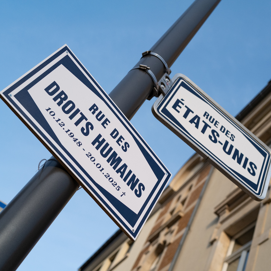 According to Amnesty International Luxembourg, a sign bearing the words “Rue des droits humains” was raised in front of activists and other supporters of the organisation, which defends human rights worldwide. The sign bears the dates 10 December 1948, the day the Universal Declaration of Human Rights was adopted, and 20 January 2025, the beginning of President Trump’s second term.