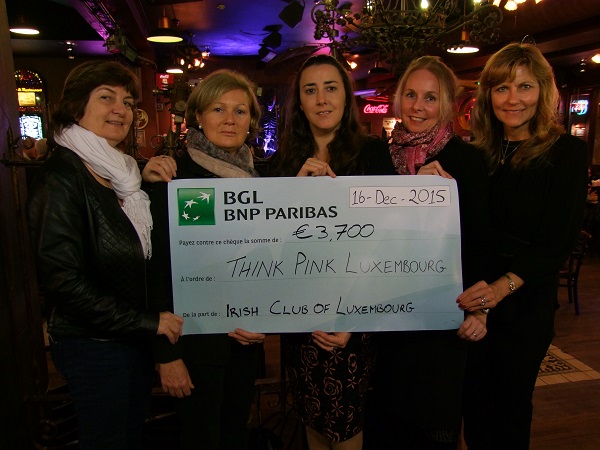 The Irish Club of Luxembourg (ICL) has made a presentation of €3,700 to Think Pink Lux, a charity that supports women living in Luxembourg in their fight with the day to day reality of cancer, fund research and raises awareness of cancers that particularly affect women.