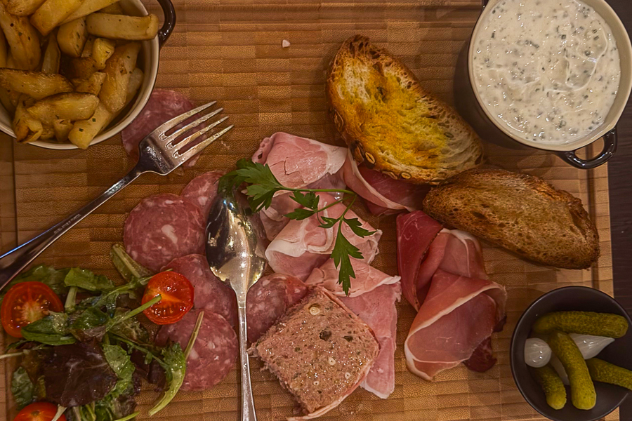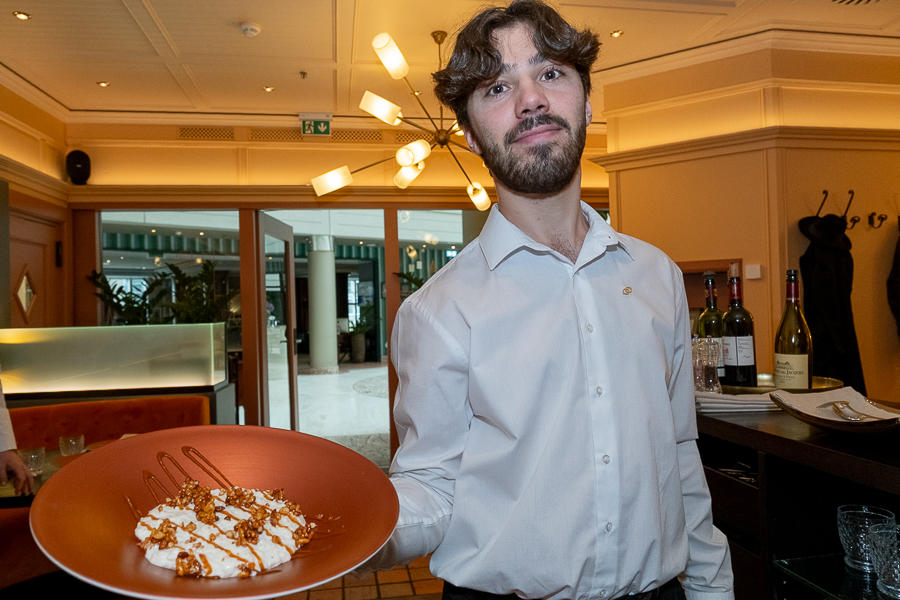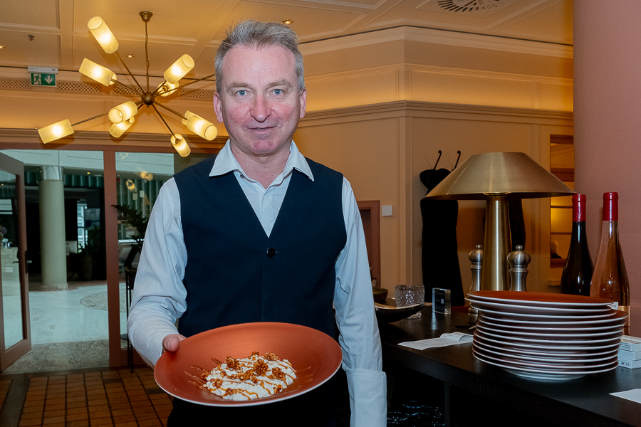 Julien Marchesini, Director of F&B at the Sofitel, explained that almost all ingredients are fresh and local from Luxembourg, apart from some fish dishes (Mediterranean sea bass and smoked herring), but including the hams and salami on the charcuterie board as well as the main dishes of beef (both rib-eye and tenderloin/filet) and Bouchée à la Reine (chicken), with local vegetables the main ingredients in the rustic terrine (starter) and vegetable fricasee (main dish), with side dishes also including the Luxembourg favourite Gromperekichelcher and small boiled potatoes. The daily "suggestions" currently include meat dishes with venison or wild boar, as it is currently the hunting season in the Grand Duchy.