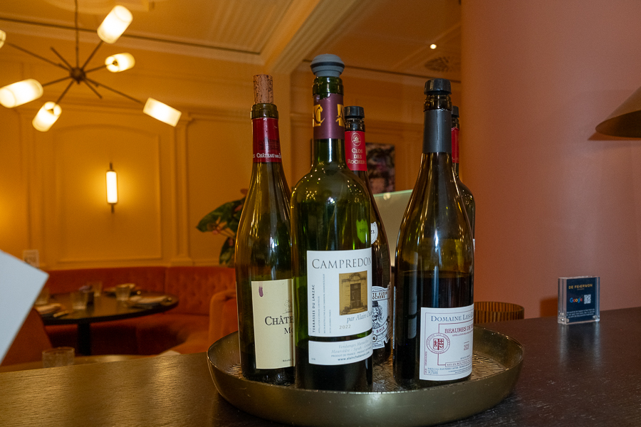 The wine list includes both Luxembourgish (Moselle, from Bernard-Massard) and French (from five different regions: Bordeaux, Rhône valley, Languedoc, Bourgogne and Provence) wines.