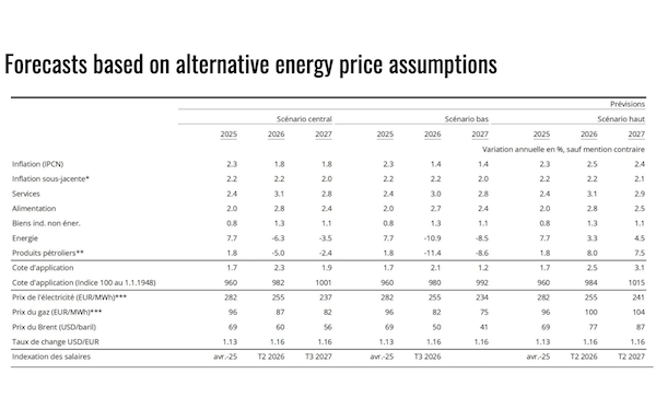 In the high-price scenario for Brent crude, STATEC noted upward risks linked to renewed geopolitical tensions, potential supply disruptions and stronger-than-expected global demand. Under this scenario, Brent prices would rise by 11% in 2026 and by a further 13% in 2027. Conversely, the low-price scenario assumes a persistently oversupplied global market, continued growth in non-OPEC production and weaker demand in a sluggish global macroeconomic environment, compounded by the long-term effects of the energy transition. In this case, Brent prices would fall sharply by 27% in 2026 and by 19% in 2027.