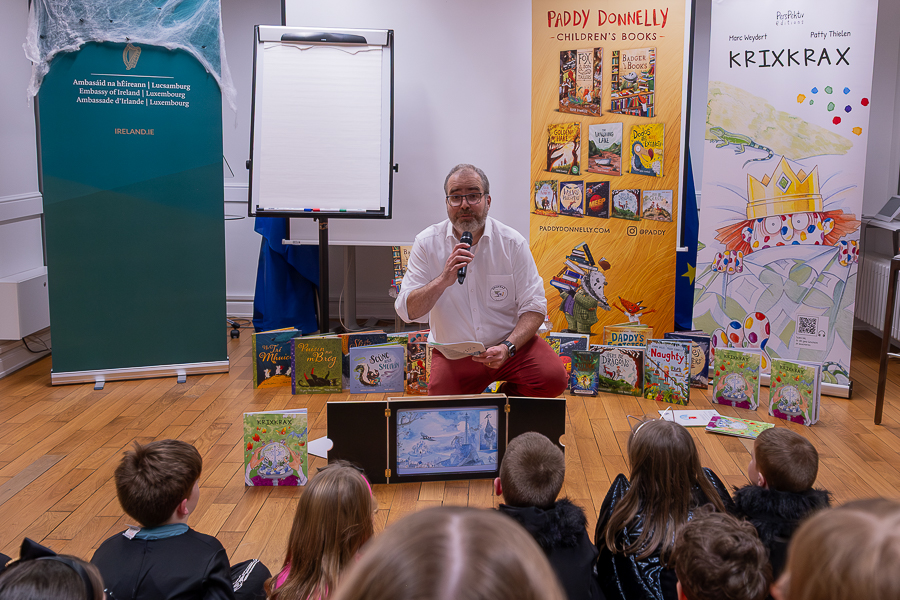 On Thursday 30 October 2025, the Embassy of Ireland in Luxembourg hosted a Hallowe’en storytelling evening at the Foyer Européen in Luxembourg-Gare for the young members of the community, which featured children’s authors Paddy Donnelly and Marc Weydert.