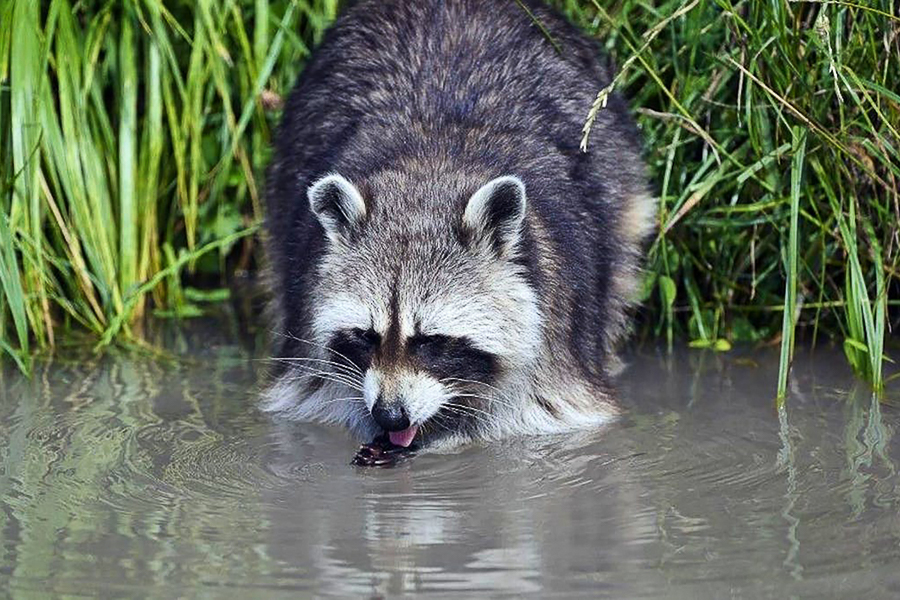 Raccoons are medium-sized mammals measuring 40–70 cm in body length, with a tail of 20–40 cm. They weigh between 5 and 15 kg. Their thick greyish-brown fur, masked face and distinctive black “bandit” markings make them instantly recognisable. Highly dexterous front paws allow them to manipulate food and objects. Despite their bushy tail, their body is muscular and agile, enabling them to climb trees, swim and explore both wetlands and forest edges efficiently.