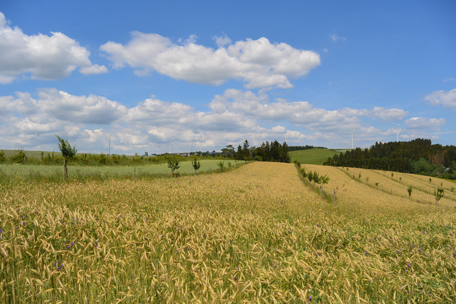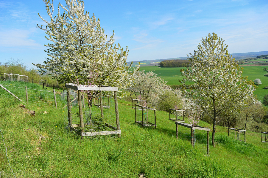 The revitalisation of this agricultural landscape has been a successful cooperative effort since November 2011. Several partners have played a vital role: for seven years, the Forum pour l'Emploi cultivated several hectares of vegetables for its Am Gaertchen project. Furthermore, a small herd of Galloway cows, currently managed by an organic farmer from Hupperdange, overwinters on a dedicated plot featuring a cattle shelter built in 2013 by the LIFE Éislek project. The majority of the land is now managed by the "Naturhaff" organic farm in Derenbach, which employs no-till farming techniques to maximise soil health.