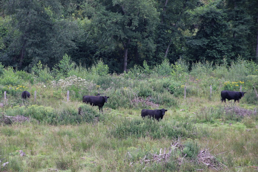 The left bank of the site remains a highly diverse typical mowing meadow, exhibiting characteristics of a lowland swamp. In stark contrast, the alluvial plain on the right bank was occupied by nearly five hectares of spruce forest. These conifers were ill-suited to the waterlogged ground, developing diseases like red rot. Furthermore, their shallow root systems promoted bank erosion and the needle litter impoverished the soil quality. To correct this inappropriate land use, the entire spruce plantation was deforested. The spruces were removed while strictly respecting the watercourses and maintaining the site's inherent wet character. The site has subsequently been converted into an open landscape, now managed through extensive grazing using Angus cattle, applied for a limited period annually, without fertilisers or pesticides.