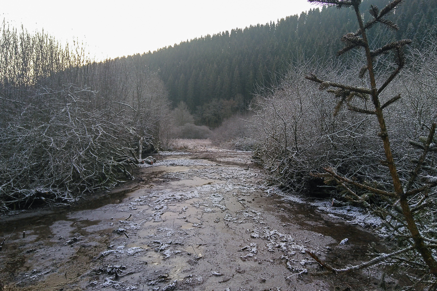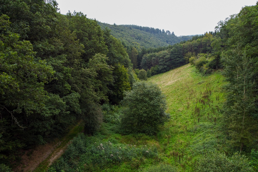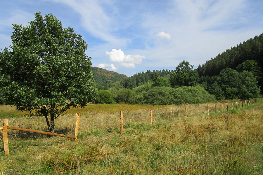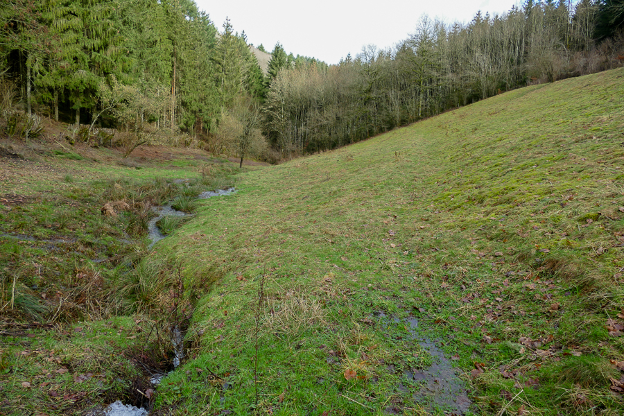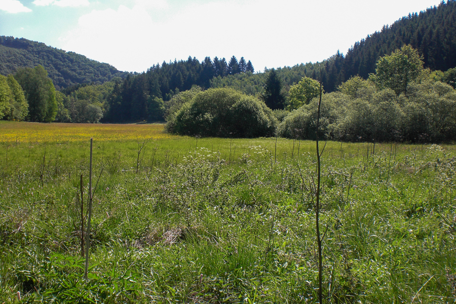 Another ecological hotspot is the small Hohlsber valley near Boulaide. Like most Ardennes valleys, this one bears the traces of often-forgotten cultural heritage: the irrigation channels (Fléizen in Luxembourgish) used for meadow inundation. This technique was historically practiced across Europe (Black Forest, Saar, Eifel) to naturally fertilise hay meadows and enhance the quality of the second annual hay harvest. This complex system involved manually diverting the stream water via parallel channels at regular intervals to flood the meadows. After World War II, this manual irrigation system became obsolete as chemical fertilisers dramatically increased yields and agricultural mechanisation led to the gradual filling-in of these ditches. The steep-sloped meadows that could not be cultivated mechanically were then converted into conifer forests, left fallow, or turned into pastures.