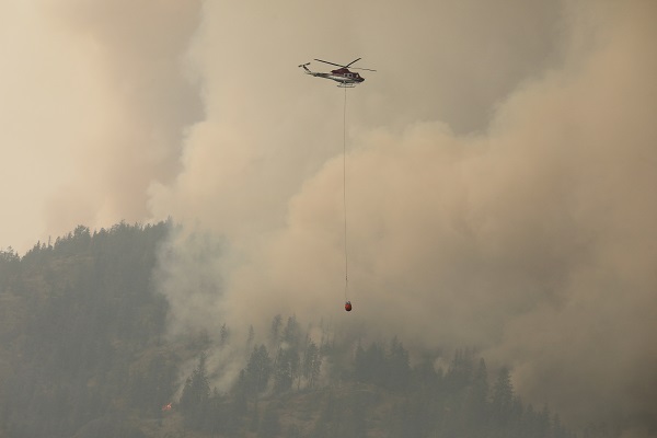 A helicopter carries a water bucket while battling the McDougall Creek wildfire outside the Okanagan community of West Kelowna, British Columbia, Canada, on 18 August 2023.;