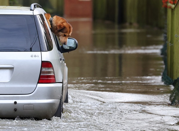 A dog looks out of a vehicle driving along a flooded road in the aftermath of Storm Henk, at Henley-on-Thames, United Kingdom, 5 January 2024;