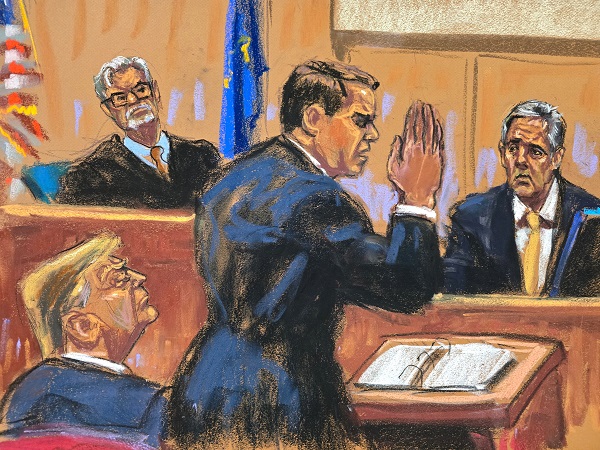 Michael Cohen asked about taking an oath as he is cross-examined by defence lawyer Todd Blanche during former US President Donald Trump's criminal trial, in Manhattan state court in New York City, US, 16 May 2024, in this courtroom sketch;