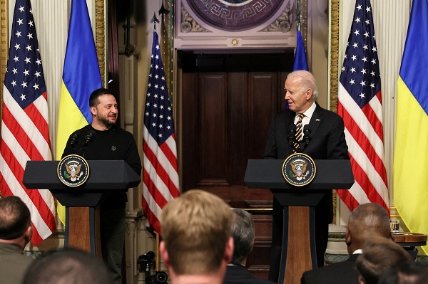 US President Joe Biden and Ukraine's President Volodymyr Zelensky react during a joint press conference at the White House in Washington, US, 12 December 2023;