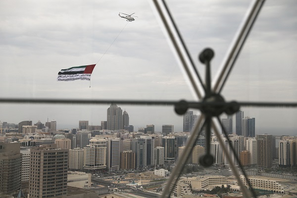 A helicopter flies over the downtown skyline, amid the COVID-19 outbreak, as seen from the Cleveland Clinic hospital in Abu Dhabi, UAE, 20 April 2020;