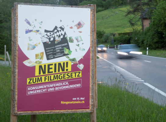 A poster reading: "No to the film law - anti-consumer, unfair, patronising" is seen on a field, before the Swiss electorate votes on several issues in a referendum next weekend, near Birmensdorf Switzerland 9 Ma 2022;