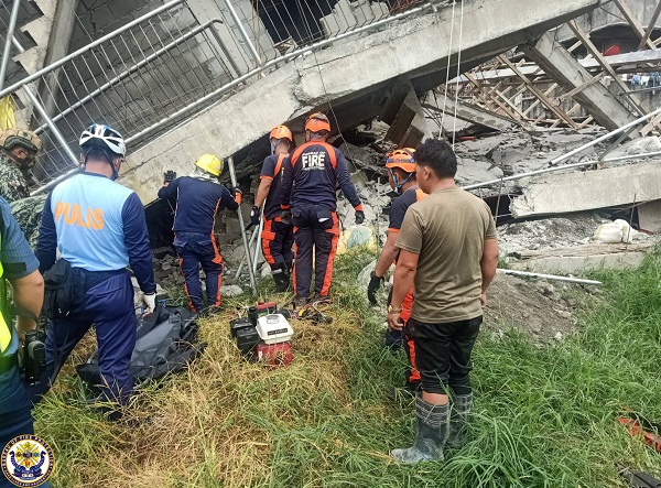 Emergency crew engages in rescue activities outside a building that collapsed during the earthquake in La Trinidad, Benguet, Philippines, 27 July 2022;