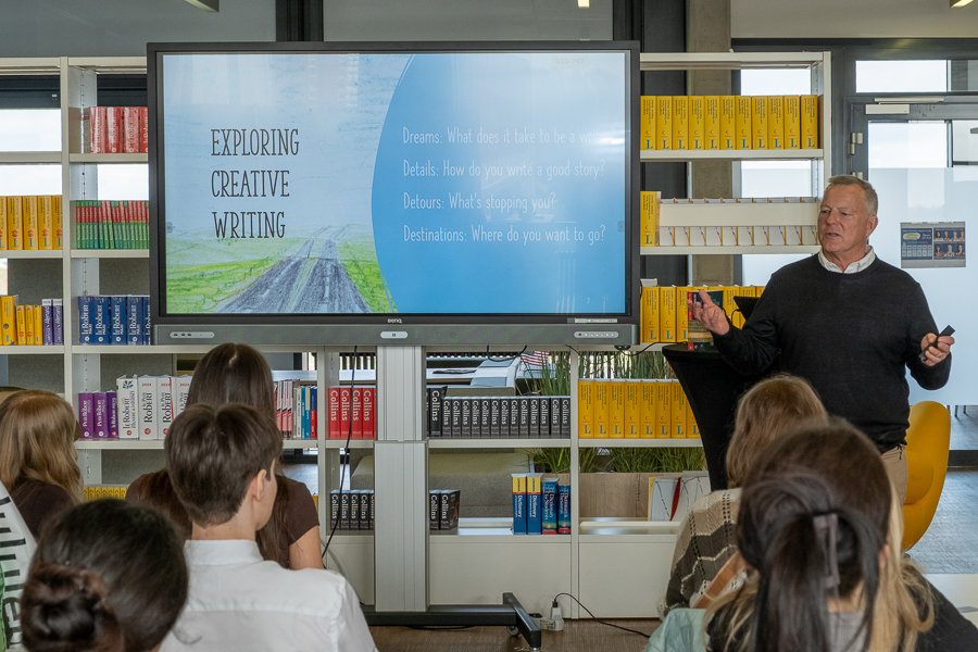 On Monday 16 March 2026, Tim Byers visited the first of a number of secondary schools in the Grand Duchy following different curricula, Lenster Lycée in Junglinster, where he held a number of workshops with students from different classes, including one on "Exploring Creative Writing" with advanced English students in the secondary school library.