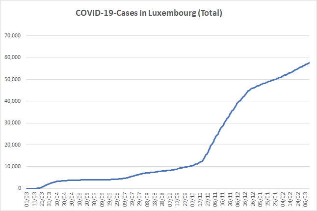 As per figures from Wednesday 10 March 2021, there are currently 2,898 active infections known, whilst a total of 53,748 people have recovered from the virus to date. The effective reproductive rate in Luxembourg stands at 0.94.