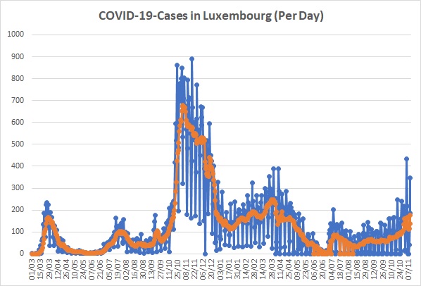 347 Luxembourg residents tested positive on Wednesday from a total of 3,825 tests carried out the day before, representing 54.67 people per 100,000 inhabitants. The positivity rate was 9.07%. Wednesday 18 November 2020 marked the record daily high of 891 new cases.