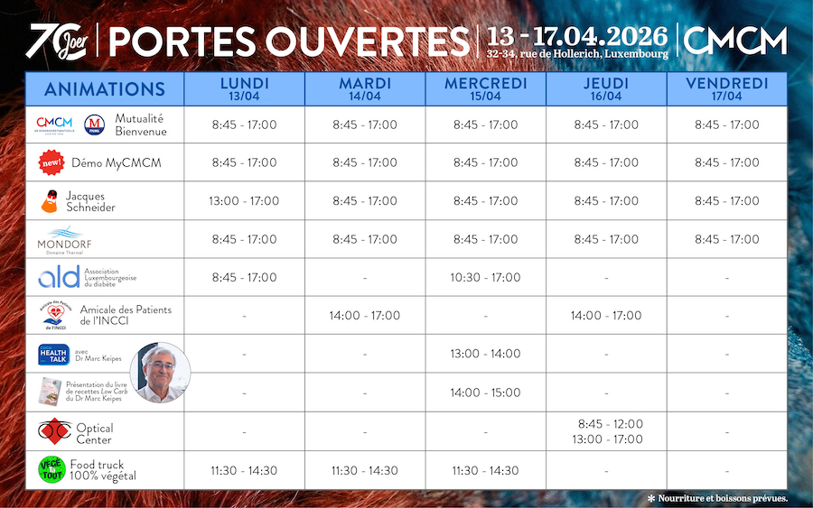 As part of its 70th anniversary celebrations, Luxembourg's health mutual fund, the Caisse Médico-Complémentaire Mutualiste (CMCM) has announced that it will host an Open Days Week from Monday 13 to Friday 17 April 2026 at its premises in Luxembourg-Gare.