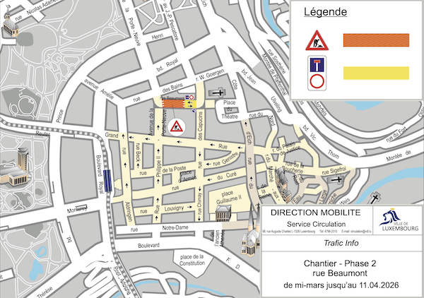 On Wednesday 11 February 2026, the City of Luxembourg (VdL) announced two phases of road works which will take place on Beaumont Street and part of Capucins Street in Luxembourg for a period of two months, beginning Monday 16 February 2026.