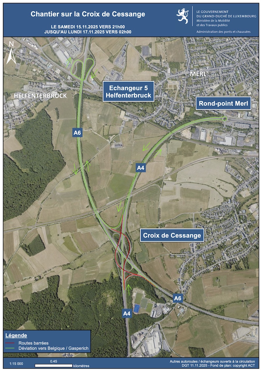 The administration said that as part of the works, traffic will be diverted from the Croix de Cessange via the A4 towards Luxembourg, the Merl roundabout, the A4 towards Esch-sur-Alzette, the Croix de Cessange, the A6 towards Belgium and the Helfenterbruck interchange.