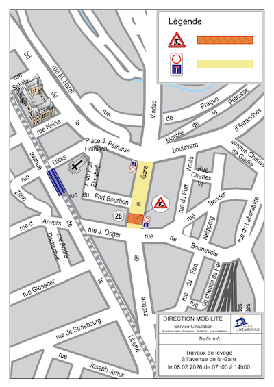 On Thursday 5 February 2026, the City of Luxembourg (Ville de Luxembourg - VdL) announced that avenue de la Gare will be closed due to lifting works, which will take place on Sunday 8 February 2026 from 07:00 to 14:00, in front of the building located at 28 avenue de la Gare.