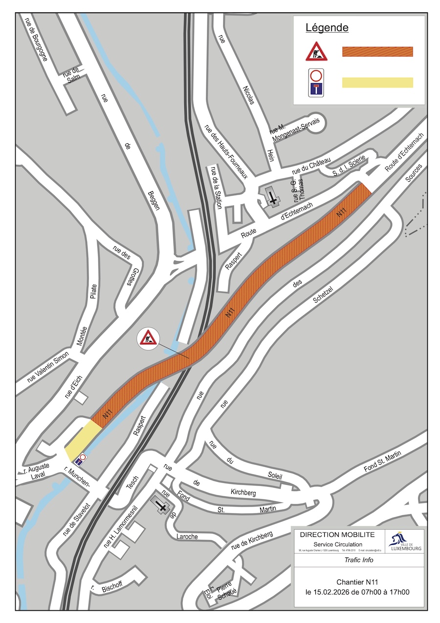 The City of Luxembourg (VdL) and the Public Roads Administration have announced that as part of tree pruning along the New Echternach Road (N11), the road will be closed to all traffic on Sunday 15 February 2026, from 07:00 to 17:00.