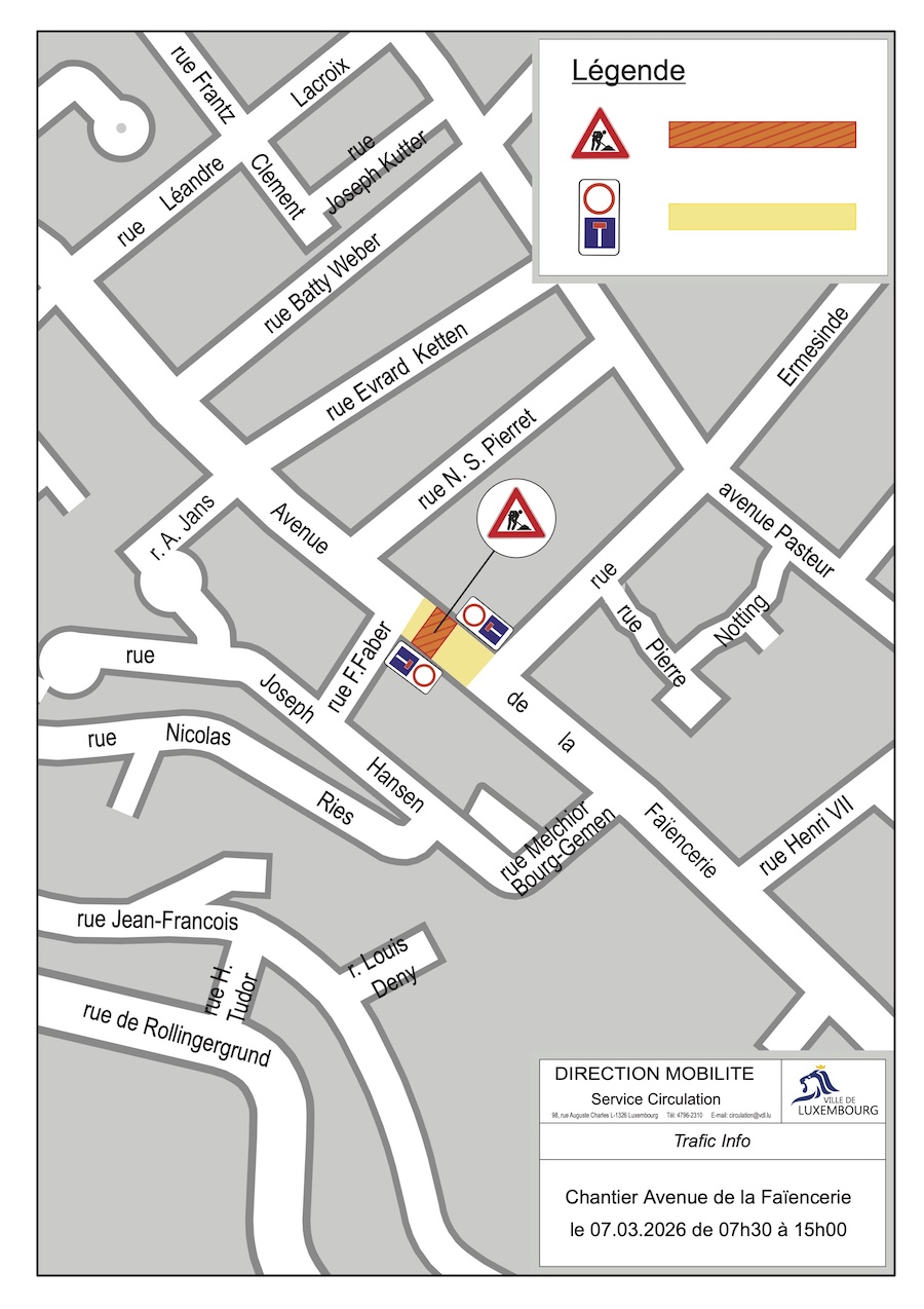 According to the VdL, the works will take place in front of 96 Avenue de la Faïencerie between the hours of 07:30 and 15:00 on Saturday. As a result, the road will be closed to all traffic between building numbers 96 and 100 and there will be a no-through road between Rue François Faber and Rue Ermesinde.