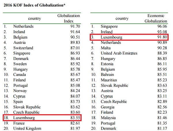 According to the KOF Globalisation Index 2016 of the KOF Swiss Economic Institute, data from 2013 placed Luxembourg in 18th place out of 207 in terms of the world's most globalised countries.