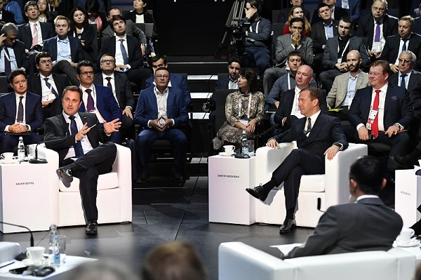 (L-R): Xavier Bettel, Luxembourg's Prime Minister; Dimitri Medvedev, Russia's Prime Minister, at the 6th International Innovation Development Forum in Moscow in October 2017;