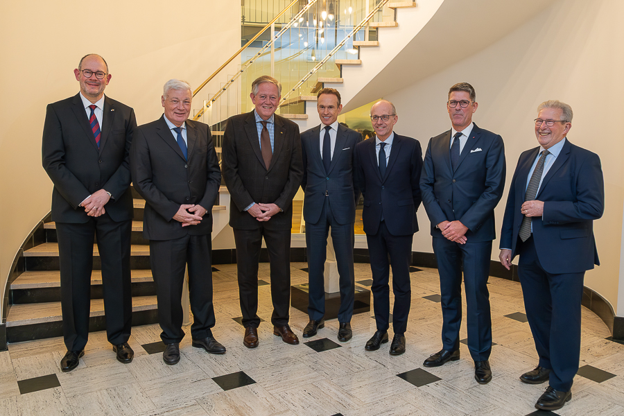 (L-R) Marc Besch, Council of State; Claude Wiseler, Parliament President; Alex Bodry, Council of State; Alain Kinsch, Council of State; Prime Minister Luc Frieden; Marc Thewes, State Council President; Mars di Bartolomeo, Parliament Vice President;