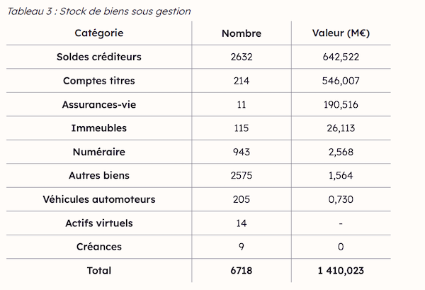 The report includes judicial statistics on seizures, restitutions, confiscations and attributions. In 2024, judicial authorities seized assets valued at €300 million and issued rulings totalling €238 million. The report also breaks down figures by asset type, legal basis, and offence category, covering seven main categories: credit balances, securities accounts, cash, virtual assets, real estate, vehicles and other goods.