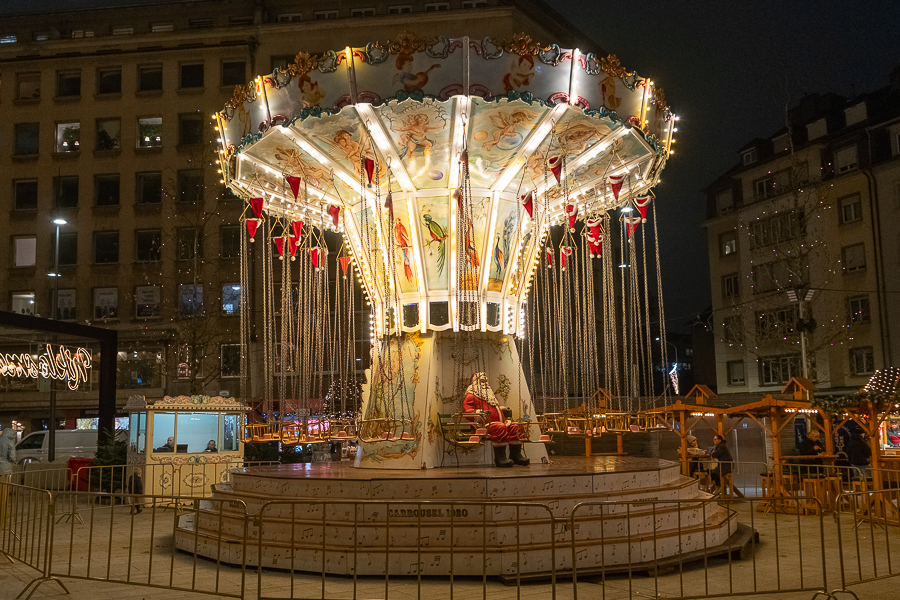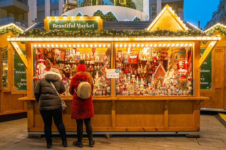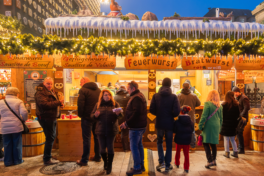 On Place de Paris in Luxembourg-Gare, the “Niklosmaart” market is split between either side of the square. One side features around eight chalets offering a variety of seasonal foods including crêpes, waffles, spätzle and fried sausages along with a Christmas carousel to keep children entertained. Seating options are limited, but this part of the market is open and easy to navigate, with queues for food and drink moving noticeably quicker than those at the larger markets.