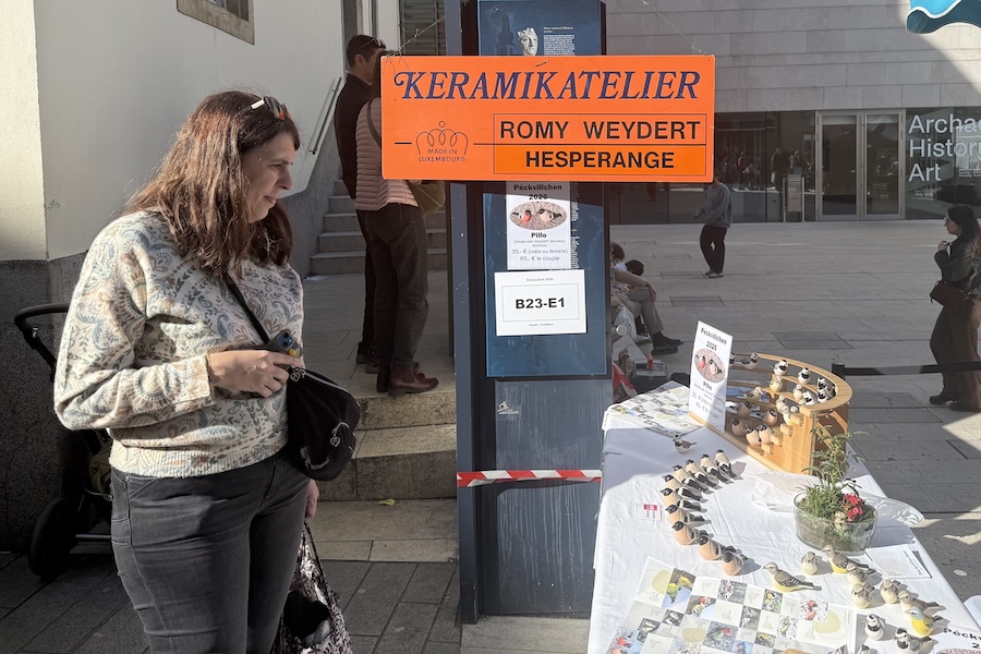 She also noted the growing interest in collecting “Péckvillercher”, with some visitors returning each year in search of new designs. As an outsider to Luxembourg, she draws inspiration from local culture and symbols, incorporating them into her creations.