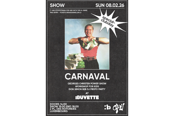 On Sunday 8 February 2026, De Gudde Wëllen will host “Carnaval - Kids Edition” at the Buvette at Rotondes in Luxembourg-Bonnevoie.