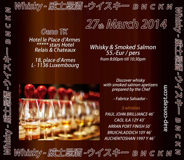 Details: ASAP Concept is organising a Whisky Tasting & Salmon event on Thursday 27 March 2014 from 20:00 - 22:30 at the Hotel Le Place d'Armes in Luxembourg city.