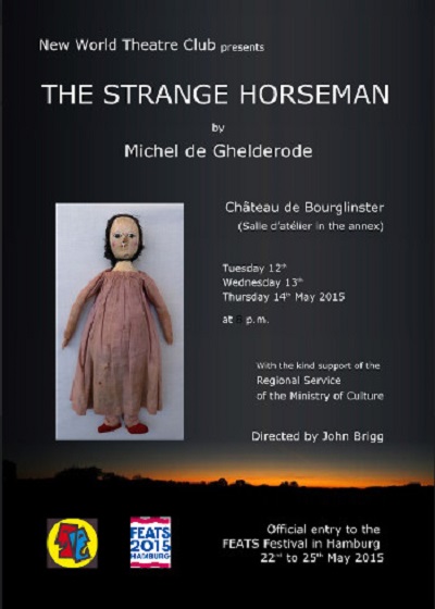 Details: On the evenings of 12 - 14 May 2015 at 19:30, the New World Theatre Club (NWTC) will put on three performances of The Strange Horseman at the annexe of the Chateau de Bourglinster, prior to travelling to participate in the 2015 FEATS (Festival of European Anglophone Theatrical Societies) that is taking place in Hamburg, Germany, from 22 - 25 May. The play is directed by John Brigg in a new translation.