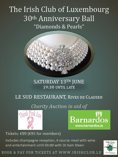 Details: The Irish Club of Luxembourg (ICL) is celebrating it's 30th anniversary this year; its annual Charity Ball on Saturday 13 June at Le Sud in Luxembourg-Clausen is based on the theme of diamonds and pearls.