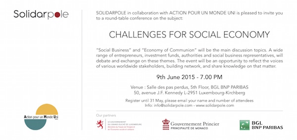 Details: Solidarpole, in collaboration with Action Pour Un Monde Uni has announced it will be holding a roundtable forum on “Challenges for Social Economy” on 9 June from 19:00 to 21:00 at BGL BNP Paribas in Luxembourg-Kirchberg.